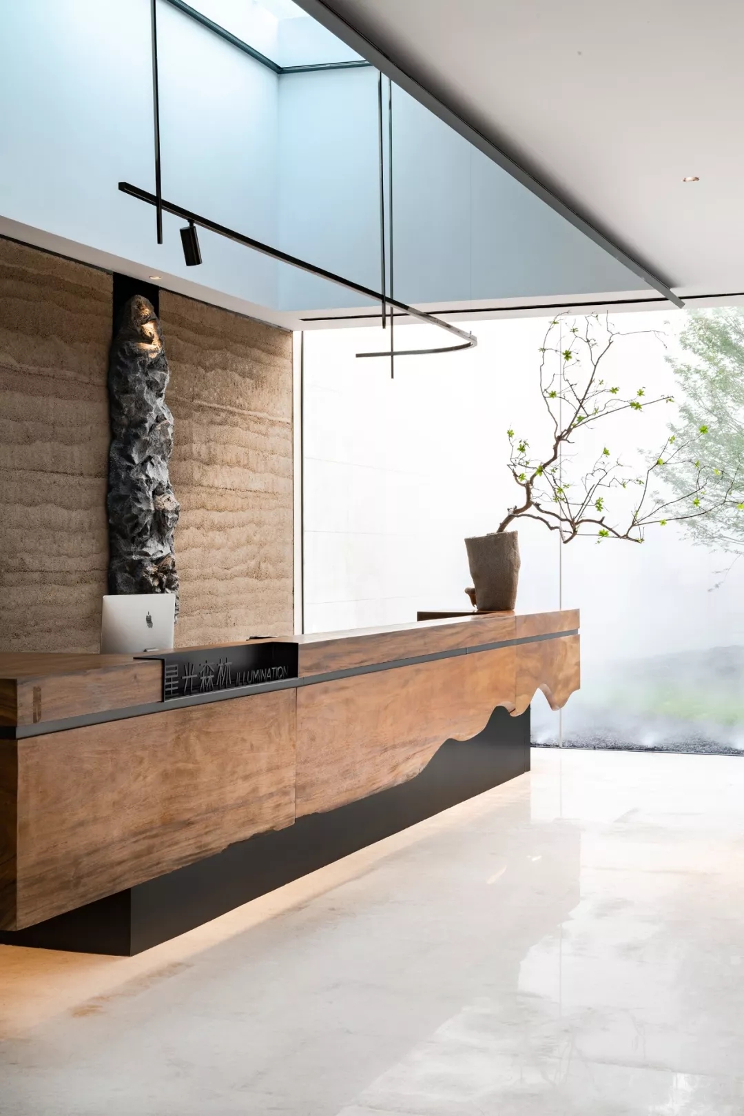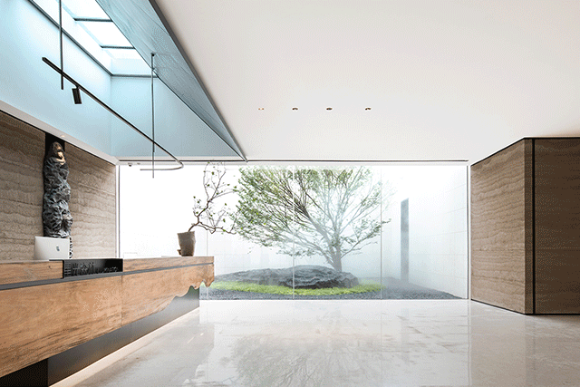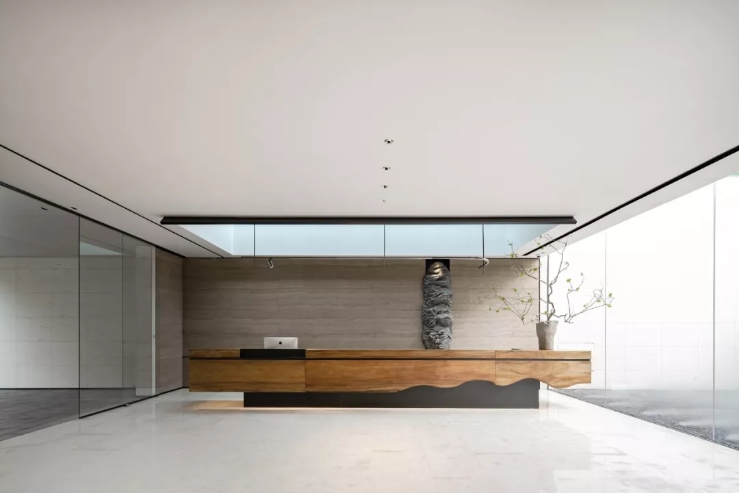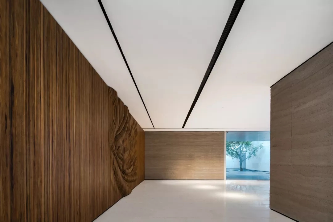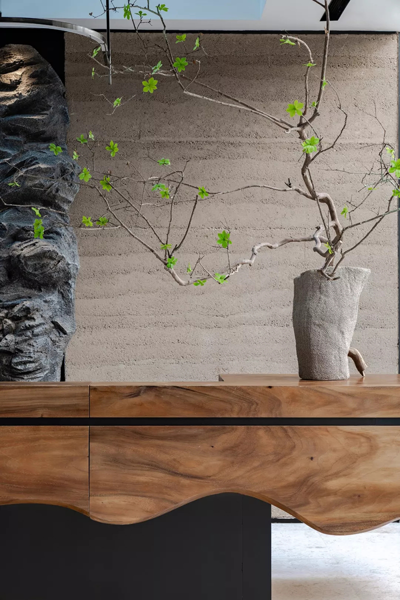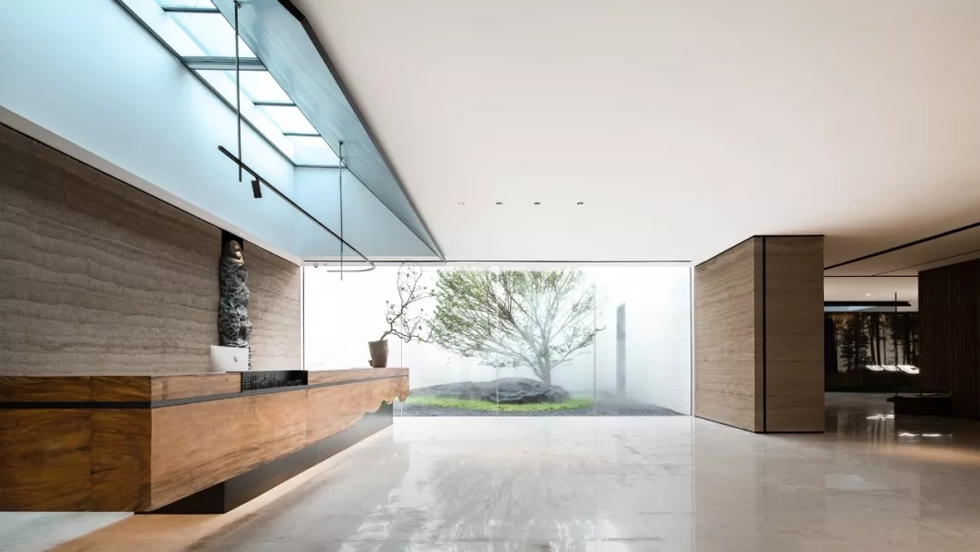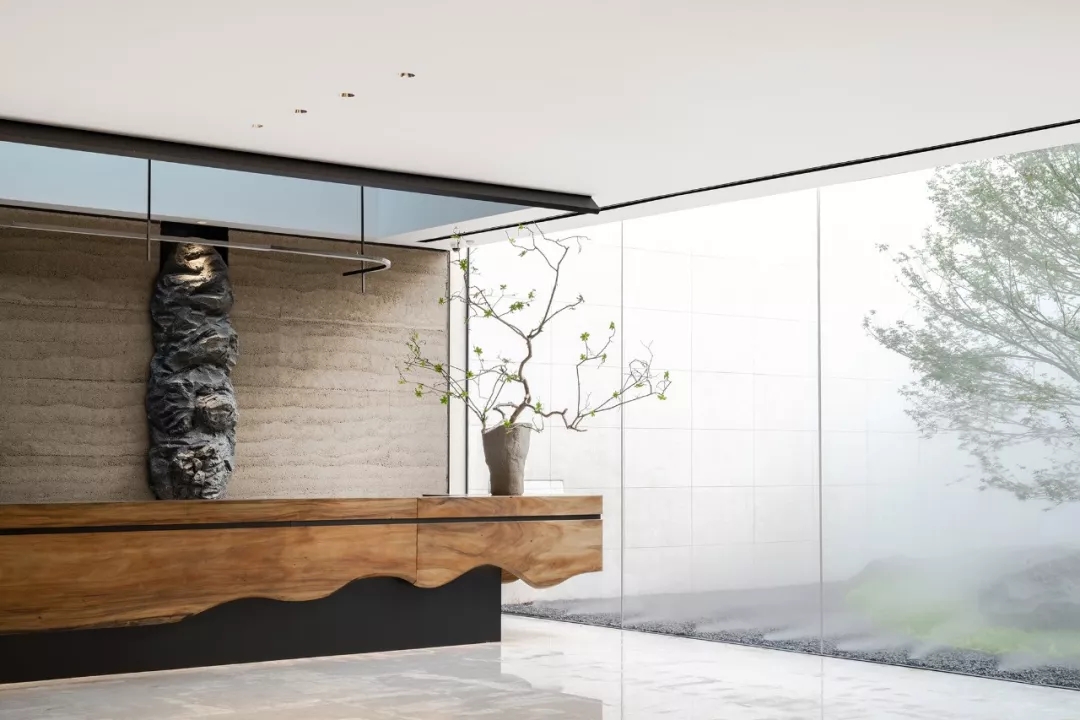 步入接待区,映入眼帘的是庭院清素的绿叶枝枒,氤氲的水汽弥漫其间,古朴粗粝的老木头质感、坚实的泰斯特灰泥夯土墙、有温度且细腻的灯光营造,分别将木、土、光元素以现代手法转化,构筑空间的内里,凸显自然人文的原生野趣与诗意。